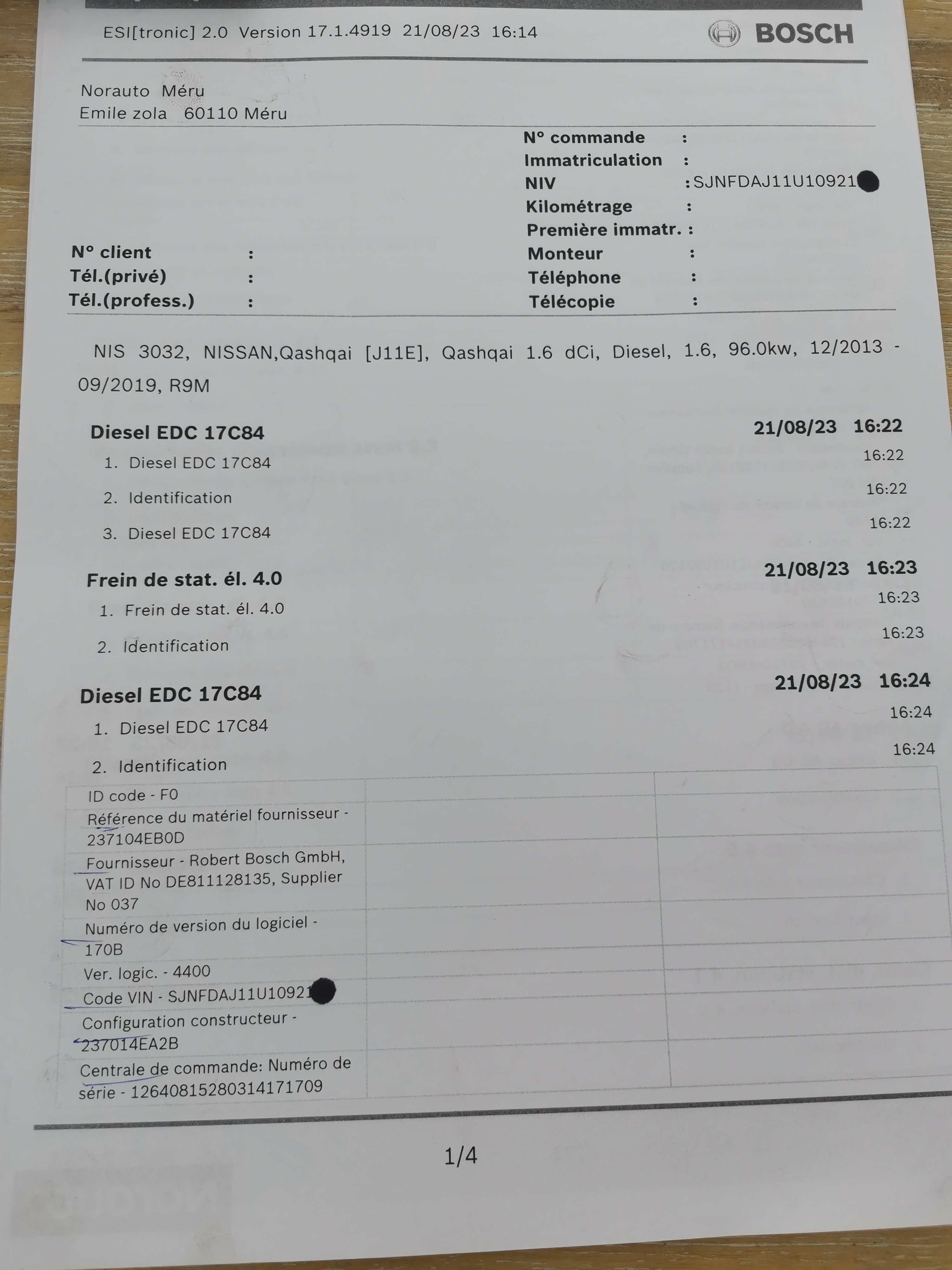 Diagnostic auto pour voyant moteur a eviter 80e !! diagnostic fait pour voyant moteur je ressors avec un diagnostique sans interprétation sur le papier en me disant que le voyant moteur est du a la climatisation a voir avec l'autre centre norauto où jai effectué les réparations de la climatisation récemment. En arrivant a l'autre centre on me sourit gentillement en me disant que le diagnostique effectué est comme ci que l on ne m'avait rien fait et qu un defaut de climatisation ne declenche pas un voyant moteur.... Bref 80e payé pour rien... 2eme diagnostique fait avec une vraie interprétation = durite percée Concernant la partie mecanique plaquettes de frein arrière changées rien a dire travail bien effectué