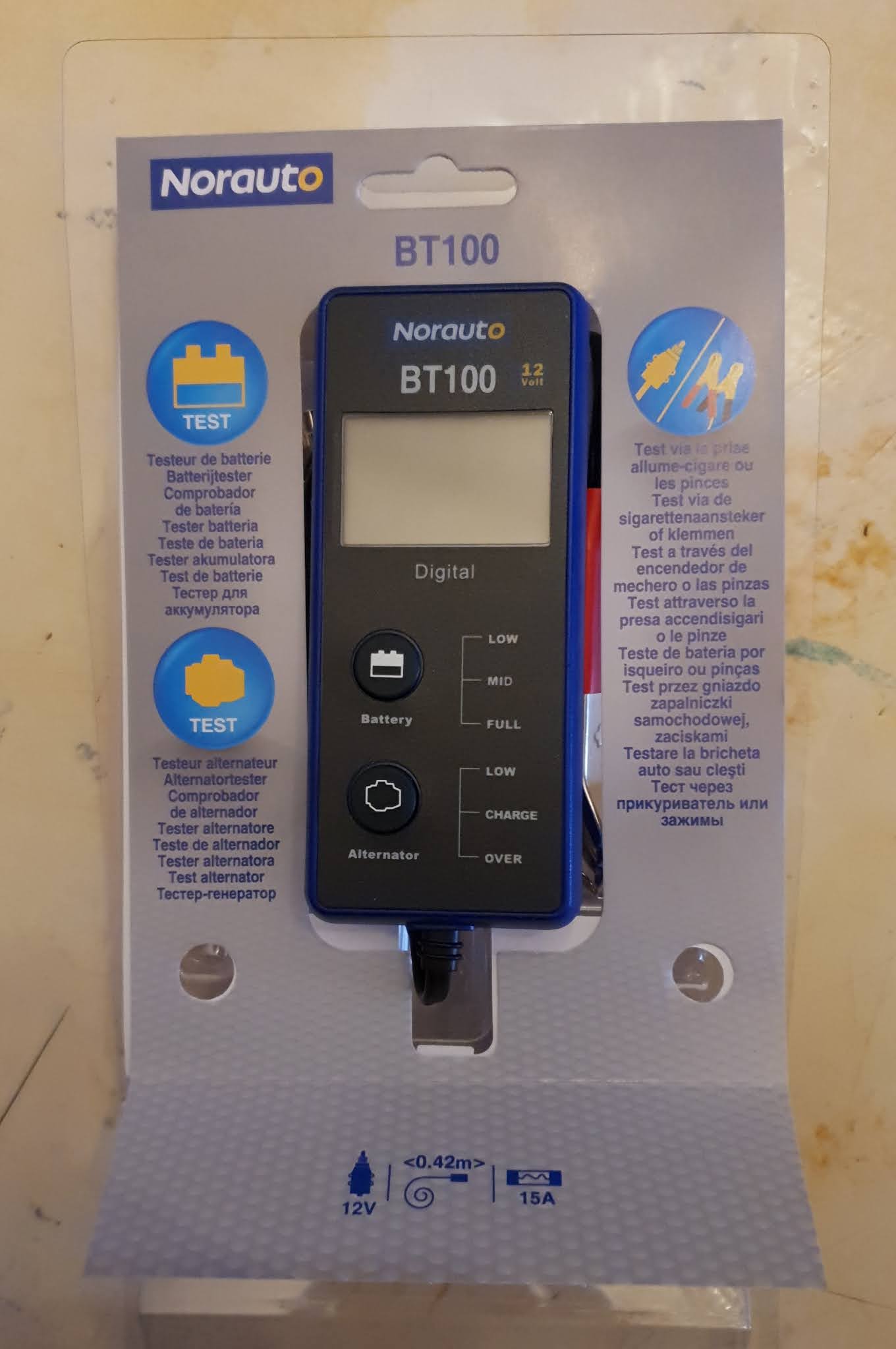 Suite à achat d'un testeur de batterie alternateur BT100 conseillé par un vendeur, qui me dit produit fiable... J'effectue un test de ma batterie qui roule peux et refuse même de démarrer. Batterie à 12,1 volt sur BT100 j'effectue une recharge complète de la batterie, suivi d'un désulfatage. Quelques jours plus tard, après avoir roule un peu je refais un test sur BT100 batterie à 12,2 volts je pense que la batterie est HS du coup sachant qu'elle démarre de façon impeccable je vais chercher mon multimètre premier prix et là je mesure sur les cosses de la batterie et j'obtiens 12,71 volts !!! je possède un multimètre pro de marque donc parfaitement étalonné; Si il le faut je ferais une vidéo concernant ce fameux BT100 qui n'est absolument pas fiable, la voiture ne roule pas une journée il donne 12,1 volts et lumière orange allumée sur mid. Je trouve cela anormal car si on se fie au BT100 la batterie considérée HS on la remplace par une neuve alors qu'en fait elle est tout a fait en état de bon fonctionnement. Une batterie est considérée comme fonctionnelle entre 12,3 à 13,5 volts !!! Du coup je me sert d'un multimètre et le BT100 ne me sert à rien !!! c'est inacceptable de commercialiser un produit pas étalonné...